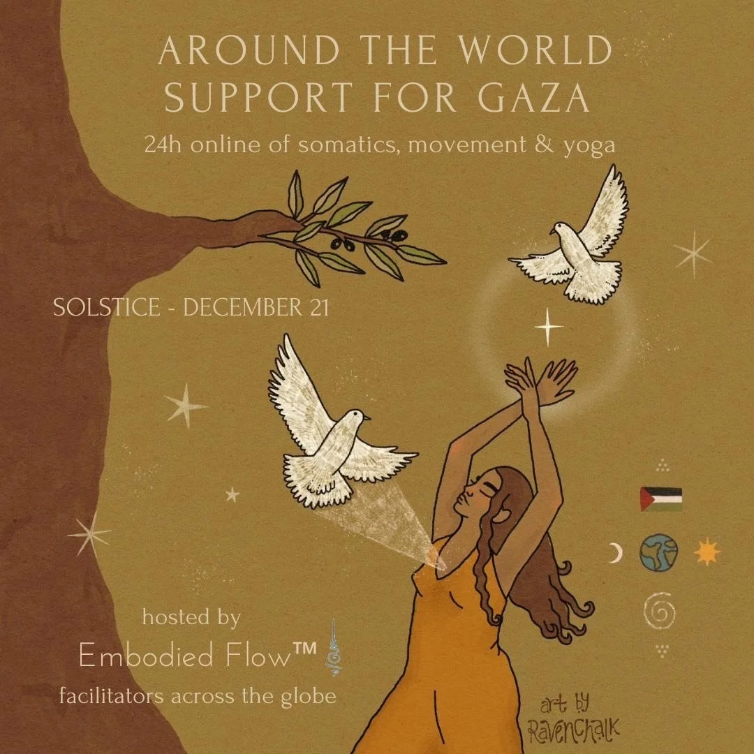 On Saturday Dec 21st, 24 Embodied Flow facilitators from around the world will offer nourishing somatic practices to usher in the Solstice, and add our voices and energy in support of a free Palestine.